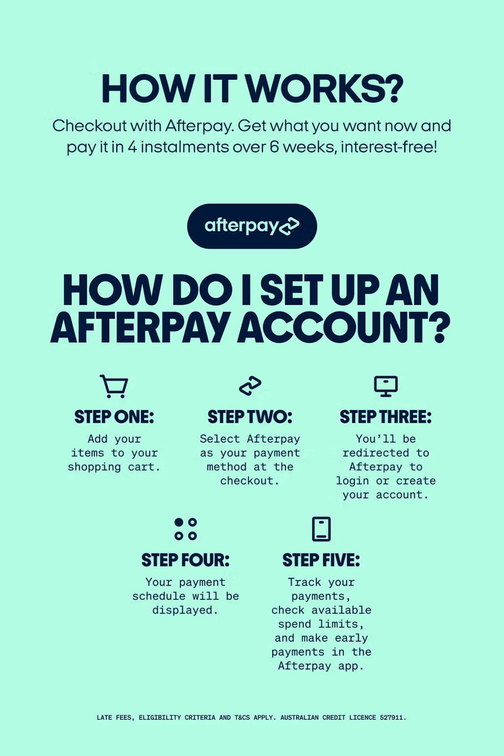 Step one: Add your items to your shopping cart. Step two: Select Afterpay as your payment method at the checkout. Step three: You’ll be redirected to Afterpay to login or create your account. Step four: Your payment schedule will be displayed. Step five: Track your payments, check available spend limits, and make early payments in the Afterpay app.