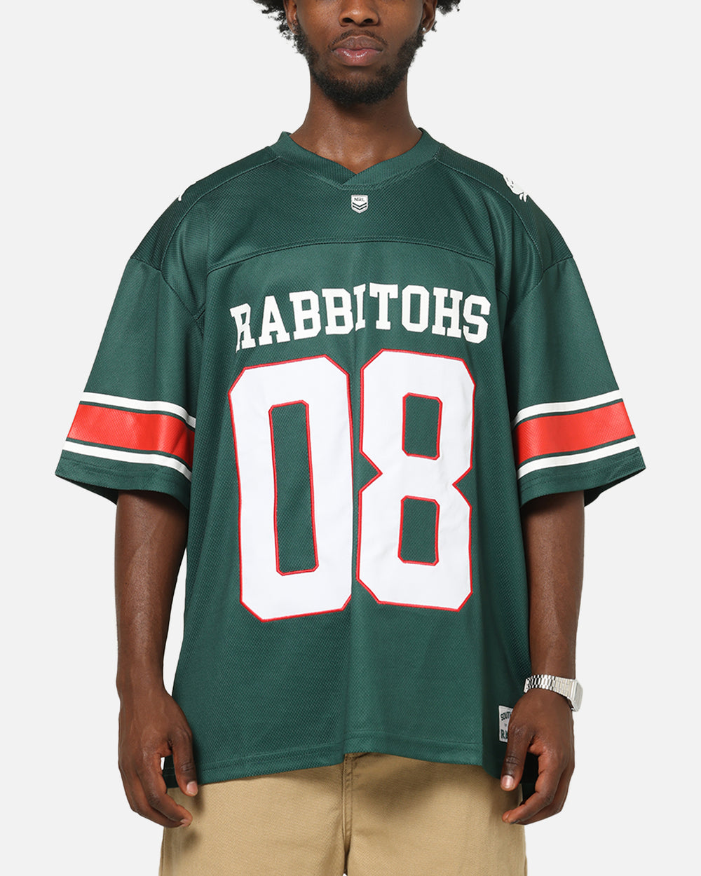 Get a look that goes hard while cheering on your fave team with the South Sydney Rabbitohs NRL Gridiron Mesh Jersey. Featuring a mix of printed graphics and embroidered team logos with ribbed v-neck collar and twin needle stitching for all day comfort that is made to last. Finished with dropped shoulders for a laidback look. Choose your team and cop yours today at Culture Kings.