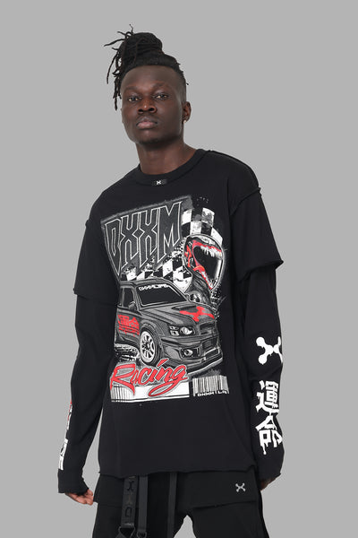 Looking for classic streetwear that goes hard? You can't go past the latest drop of DXXMLife. The L-5 B Motor Sport Long Sleeve T-Shirt is the ultimate graphic tee made for cooler days, with a layered effect and raw edge hems for a standout design. A premium cotton finish keeps you at maximum comfort. Cop this today!