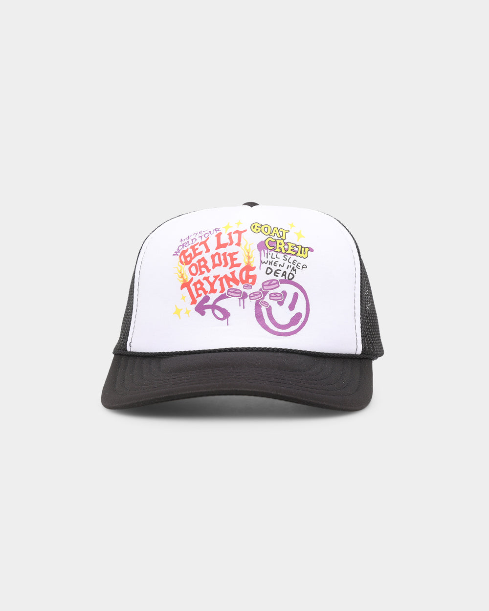 Get lit or die trying with the Get Lit Trucker Snapback from Goat Crew! Featuring bold printed graphics on a structured cap for a standout vibe. With a pre-curved brim, mesh back panels, and snapback closure for an iconic look and maximum breathability. This is the party hat of the season, cop yours today!
