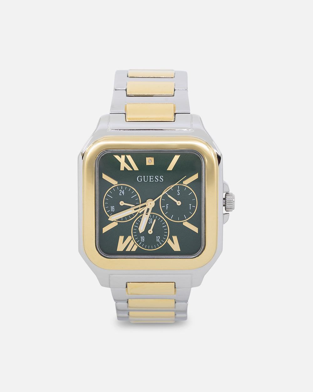 Top your look with this classic timepiece from Guess. The blend of metals on the gold and silver-toned stainless steel bracelet paired with an emerald green dial is the perfect way to take your fit to the next level and add a touch of luxury to your look. Practical as well this watch features water resistance up to 30m so you know it's ready to take on whatever the day throws at you.