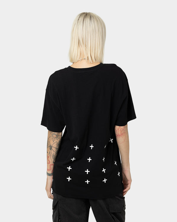 With an elongated hemline and slightly dropped shoulders giving this tee an oversized fit.