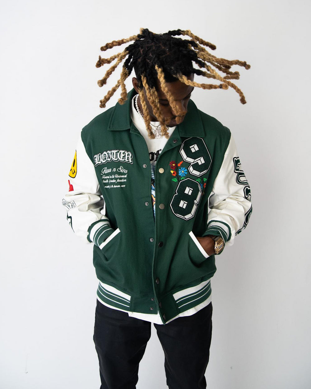 The Flaws Varsity Jacket stays true to that retro-style varsity jacket form. Featuring contrast PU leather sleeves and ribbed trims for added comfort. Premium chenille appliques all-over finish the look. When you're layering up, you'll want to grab this every time.