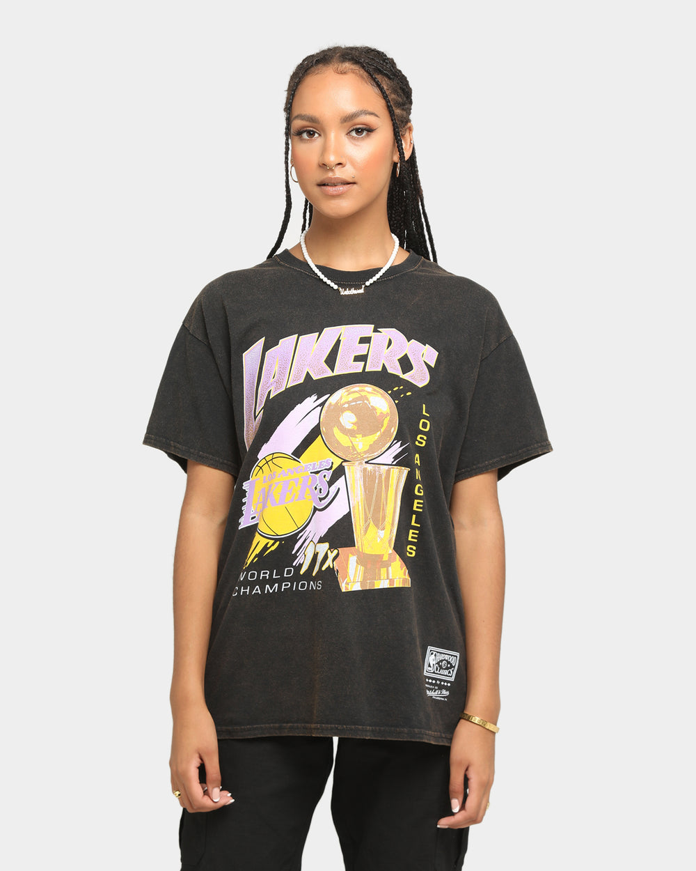 Mitchell & Ness celebrates one of the most iconic and most talked about NBA dynasties with the Los Angeles Lakers 17 Times Champ T-Shirt, the ultimate collectors item for all die hard fans. Features include a vintage acid-wash fabric treatment, crew neck, short sleeves, and throwback graphics on the chest. Officially licensed, this tee is the real winner this season thanks to the good people at Mitchell & Ness.