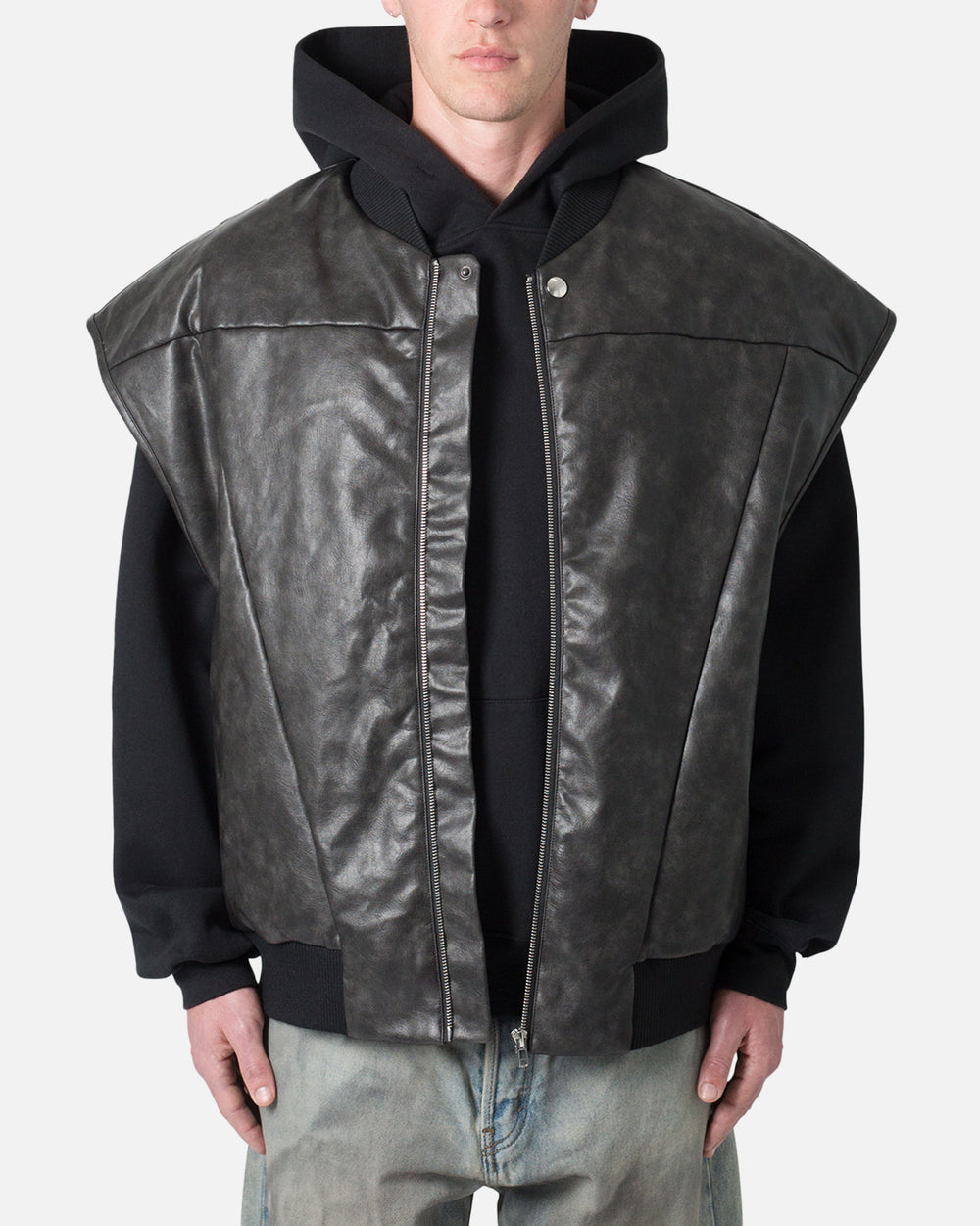 Adding the Leather Bomber Vest to your outfit rotation this season is going to be a game changer. Made with vegan leather and an oversized fit, this vest is decked out in details from the panelling to the tonal ribbing at the wait and neck. Don't sleep on this one and cop yours at Culture Kings.