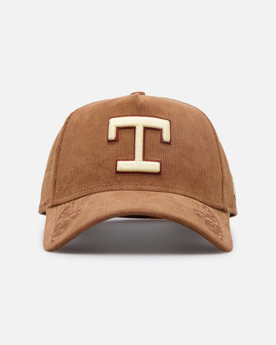The Texas Rangers Ornamental Cord 9FORTY A-Frame Snapback features an embroidered Rangers logo at the front panels with ornamental stitched details at the visor, a brown undervisor, and a snapback closure at the rear. The New Era 9FORTY® A-Frame™ is an adjustable snapback style that merges the front two crown panels into one, creating a high-profile pinched shape.