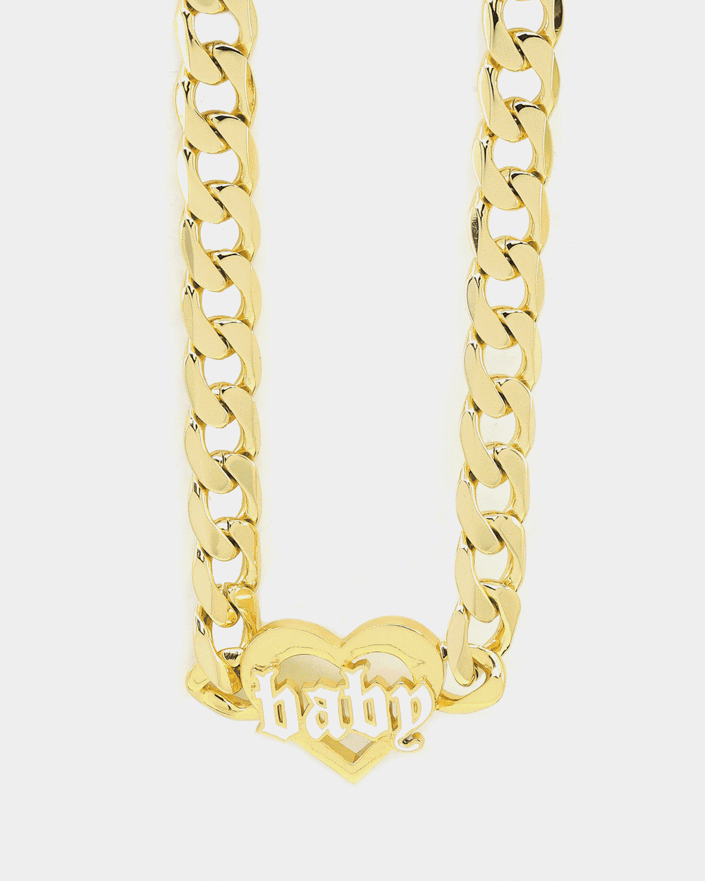 A tough chain pairs with a delicately designed heart pendant for the Love Your Girl Chain. 18k gold plating and glow in the dark detailing pair for the ultimate chain necklace to accessorise your outfit.