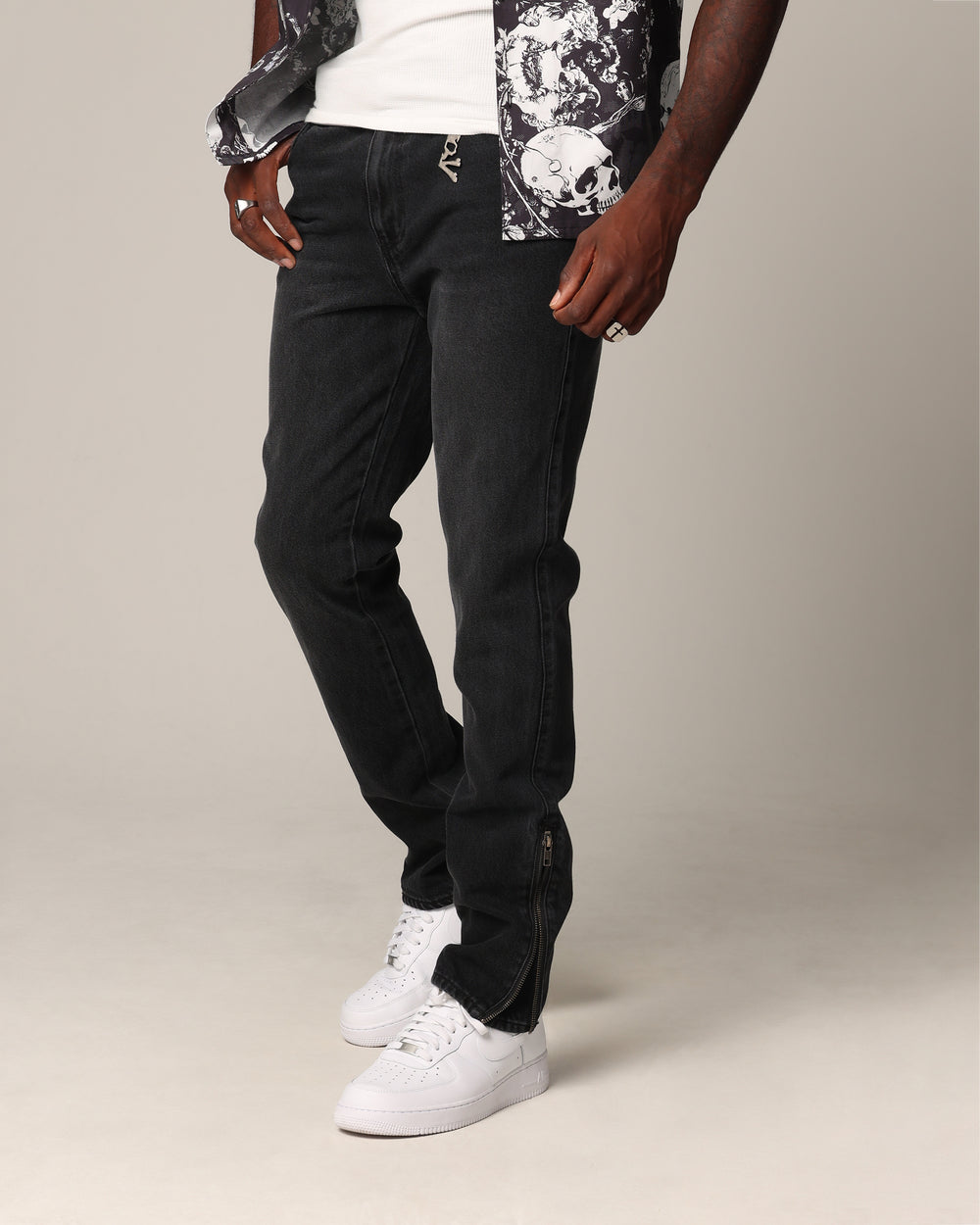 - Zip fly and button close