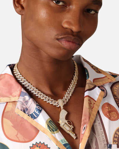 Get iced out in the Revolver Pendant. This piece is decked out in CZ stones on top of an 18k gold plated base to make you standout from the rest. You'll be feeling like a baller in this one, get your hands on it today before it's too late.