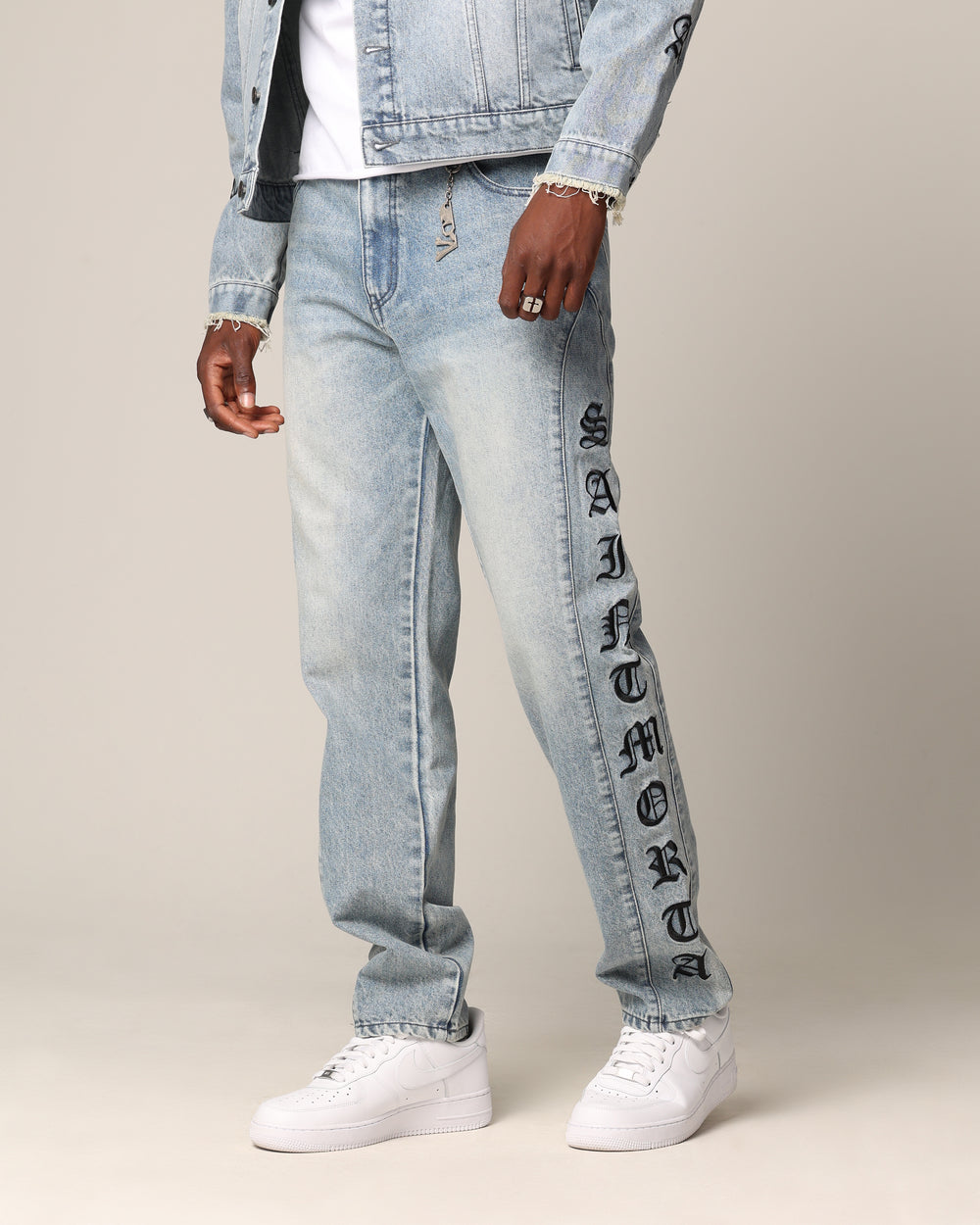 Step into the effortlessly cool Rip Gothic Psykhe Jeans. Constructed from a washed denim construction, with embroidered branding through the legs and finished off with a classic detachable metal pendant. Get your hands on a pair today, while stock lasts.