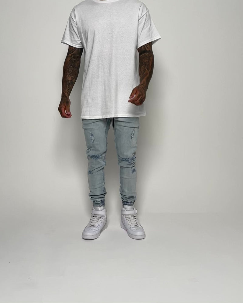 The Slasher Jogger is a brand new creation from the creative minds at Saint Morta this season. Features include an elastic waist with drawcord, heavy distressing and rips through legs, dual front & rear pockets, and elastic cuffs at both ankles. Rigid denim for that fitted look. Cop yours today!