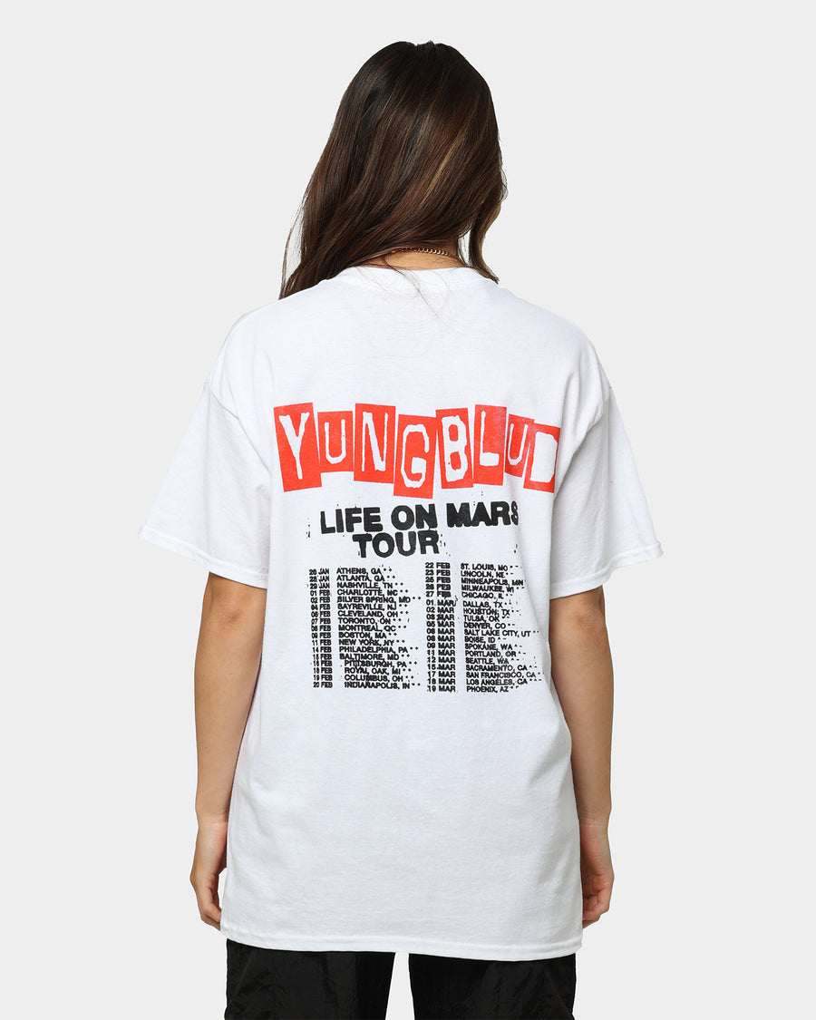 The Life On Mars Tour Vintage T-Shirt reps graphics of the English singer/songwriter YUNGBLUD's Life On Mars tour dates across the front and back. With a message of humanity and equality, this tee embraces what the singer's music is all about. Featuring cracked print for that vintage effect, twin needle stitching for durability, and soft comfortable cotton construction. Cop this fire tee, only at Culture Kings!